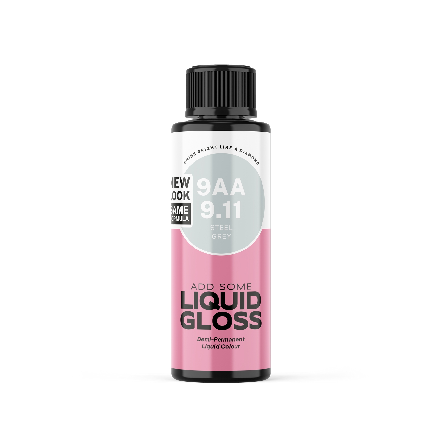 Nyanse 9AA / 9.11 Steel Grey fra serien Add Some Liquid Gloss er en lys blond (nivå 9) med dobbel askrefleks («AA») som gir en intens kald, stålgrå tone. Tonekoden 9.11 indikerer en forsterket asknyanse som korrigerer varme pigmenter og skaper et moderne, kaldt resultat med metallisk preg.